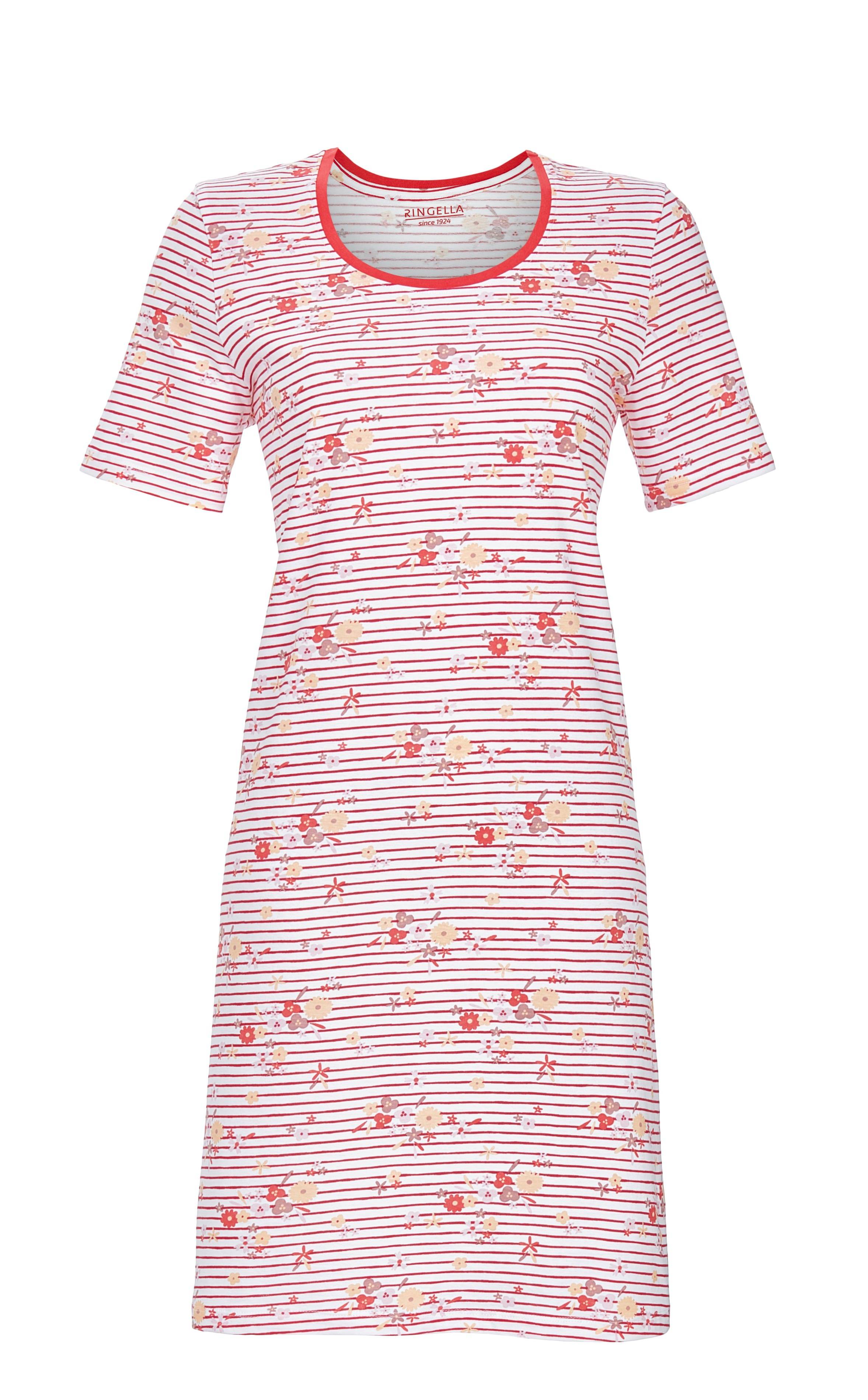 Verwöhnen Sie Ihre Haut mit diesem schicken Nachthemd im Ringeldessin mit Blümchenallover, der jedes Modell zu einem Unikat macht. Den modischen Style unterstreicht ein Kontrastpaspel am Halsausschnitt. Mit Kurzarm ideal für die warme Jahreszeit. Die weiche Single Jersey-Qualität aus reiner Baumwolle schmiegt sich hervorragend an Ihren Körper an und bietet vollsten Tragekomfort.