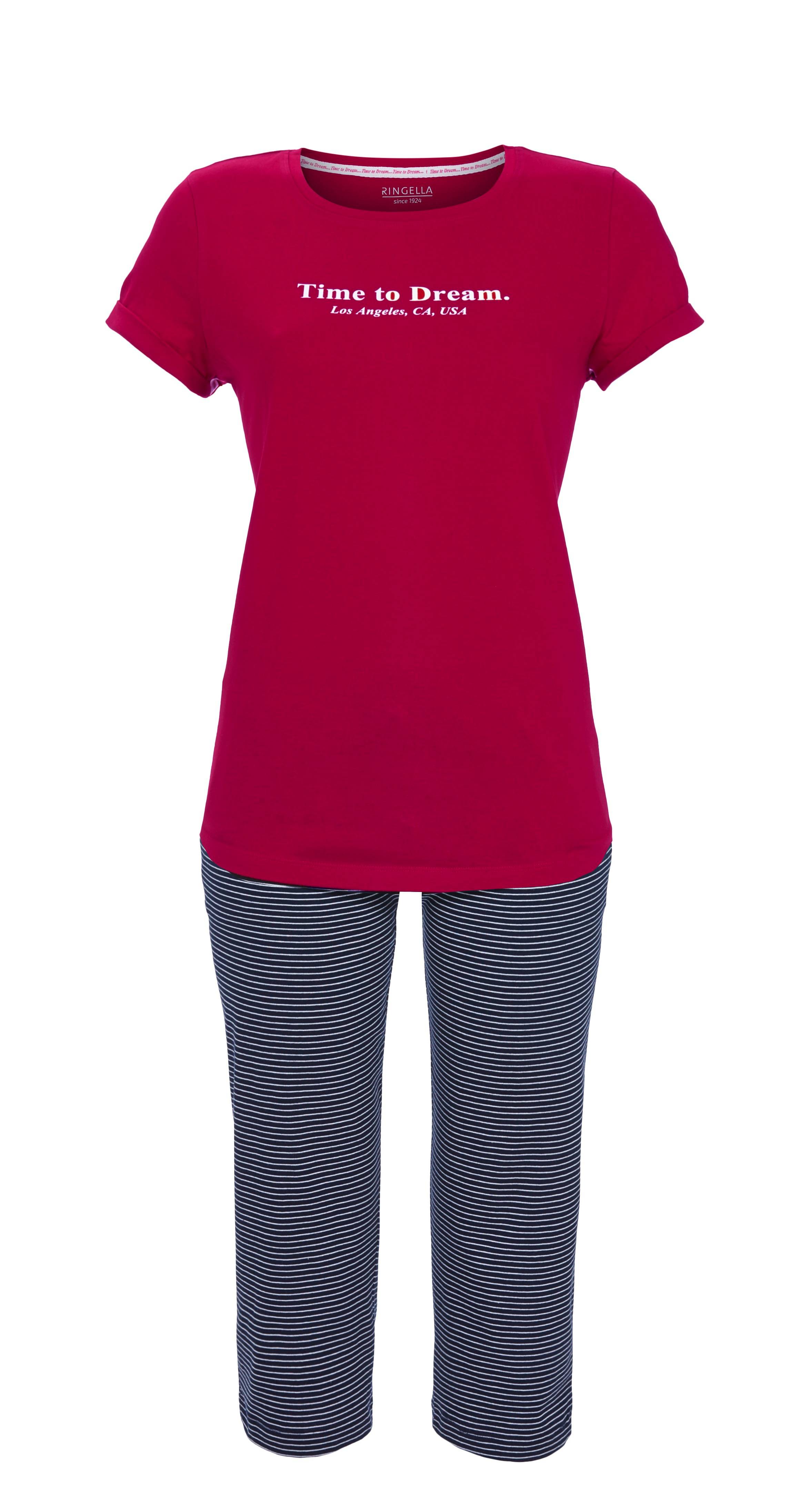 Gemütlicher Schlafanzug mit Rundhalsausschnitt und kurzen Ärmeln, sowie einer Caprihose. Das unifarbige Oberteil ist mit einem modernen Letterprint verziert, der dem Design einen lässigen Akzent verleiht. Das Ringeldessin der Hose steht für einen trendigen Style. Mit weichem Gummizugbund und seitlichen Eingrifftaschen ist die Hose einfach praktisch. Gefertigt aus reiner Baumwolle in weicher Single Jersey-Qualität, bietet er eine angenehme Haptik und atmungsaktiven Tragekomfort für eine erholsame Nacht.