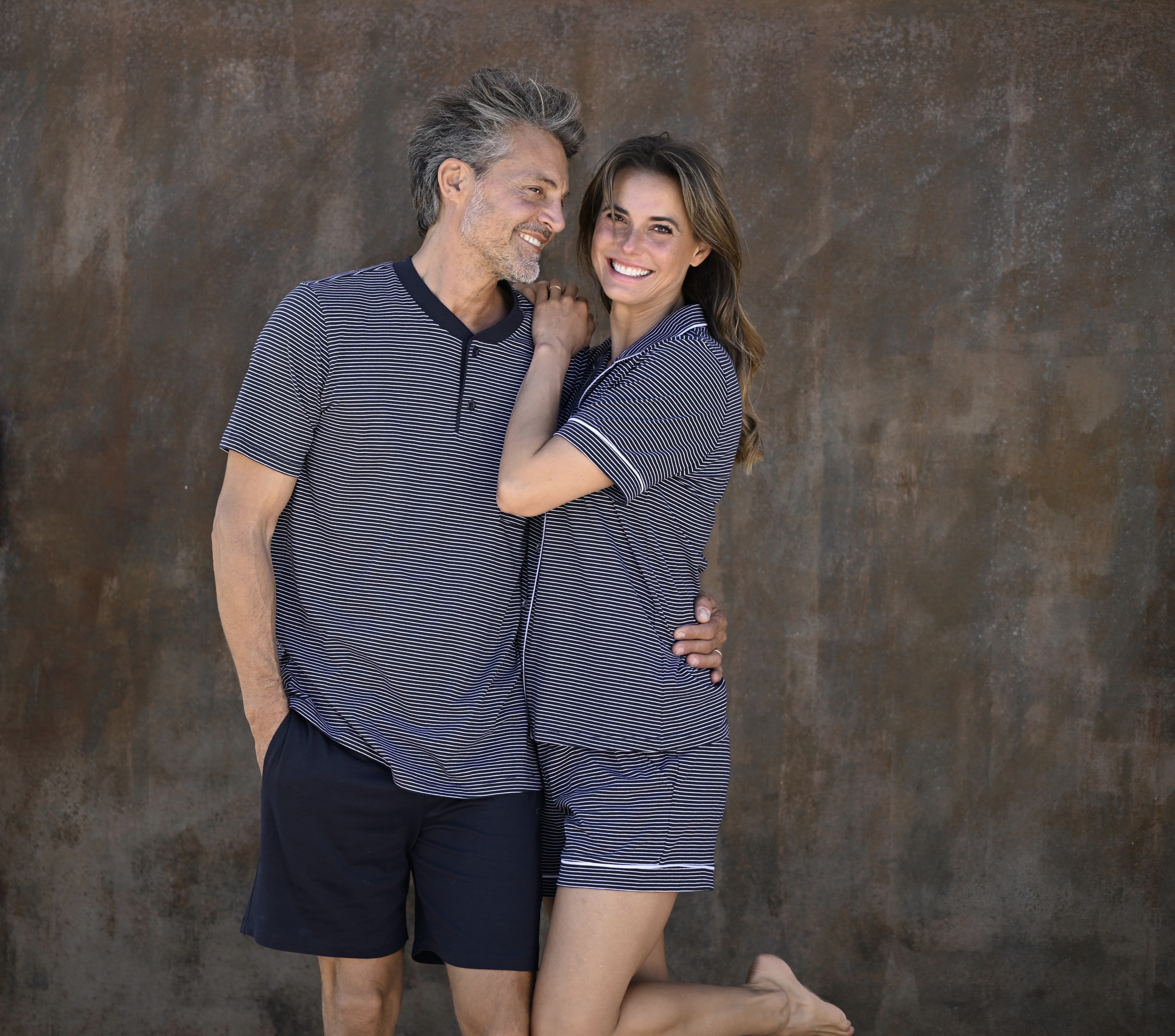 Im angesagten Ringel-Dessin ist hier das Oberteil des Kurzpyjamas aufgemacht. Ein modisches Strickbündchen am Ausschnitt mit Knopfleiste unterstreicht den trendigen Style. Die Brusttasche bietet einen kleinen Stauraum. Kombiniert wird mit einer unifarbigen Bermuda mit komfortablem Gummizugbund. Seitliche Eingrifftaschen dürfen hier nicht fehlen. Hergestellt aus hochwertiger Baumwolle liegt der Stoff angenehm weich auf der Haut. Das Material ist atmungsaktiv und pflegeleicht.