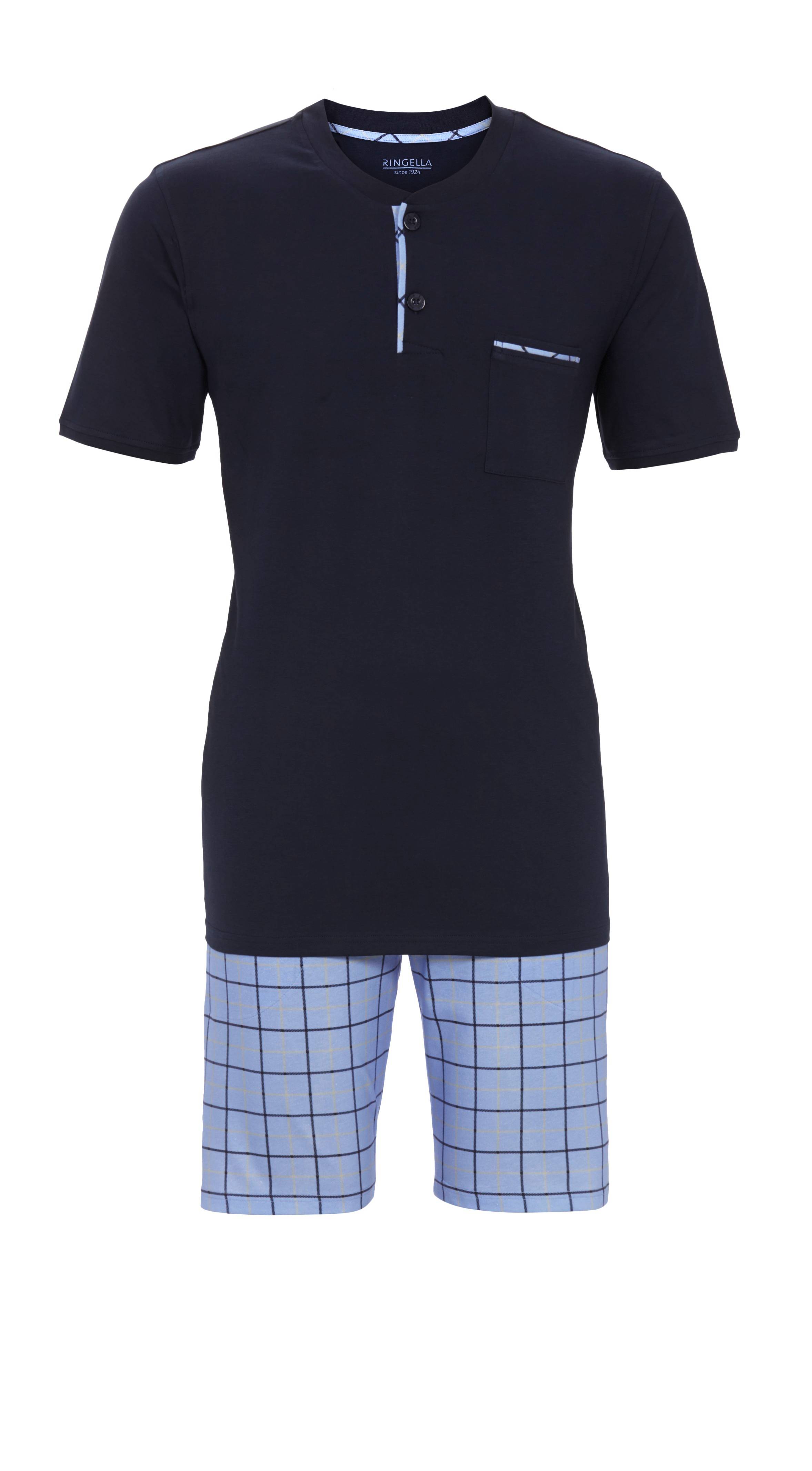 Bequemer Herren-Kurzpyjama mit unifarbenem Oberteil, ausgestattet mit Rundhalsausschnitt, Strickbündchen und kurzer Knopfleiste. Eine Brusttasche rundet das Design perfekt ab. Kombiniert wird hier mit einer Bermudahose im klassischen Karodessin mit Gummizugbund und seitlichen Eingrifftaschen. Aus reiner Baumwolle in hochwertiger Single-Jersey-Qualität, liegt der Stoff angenehm weich auf der Haut und bietet vollsten Tragekomfort. Dieser komfortable Shorty begleitet Sie problemlos durch die warme Jahreszeit.