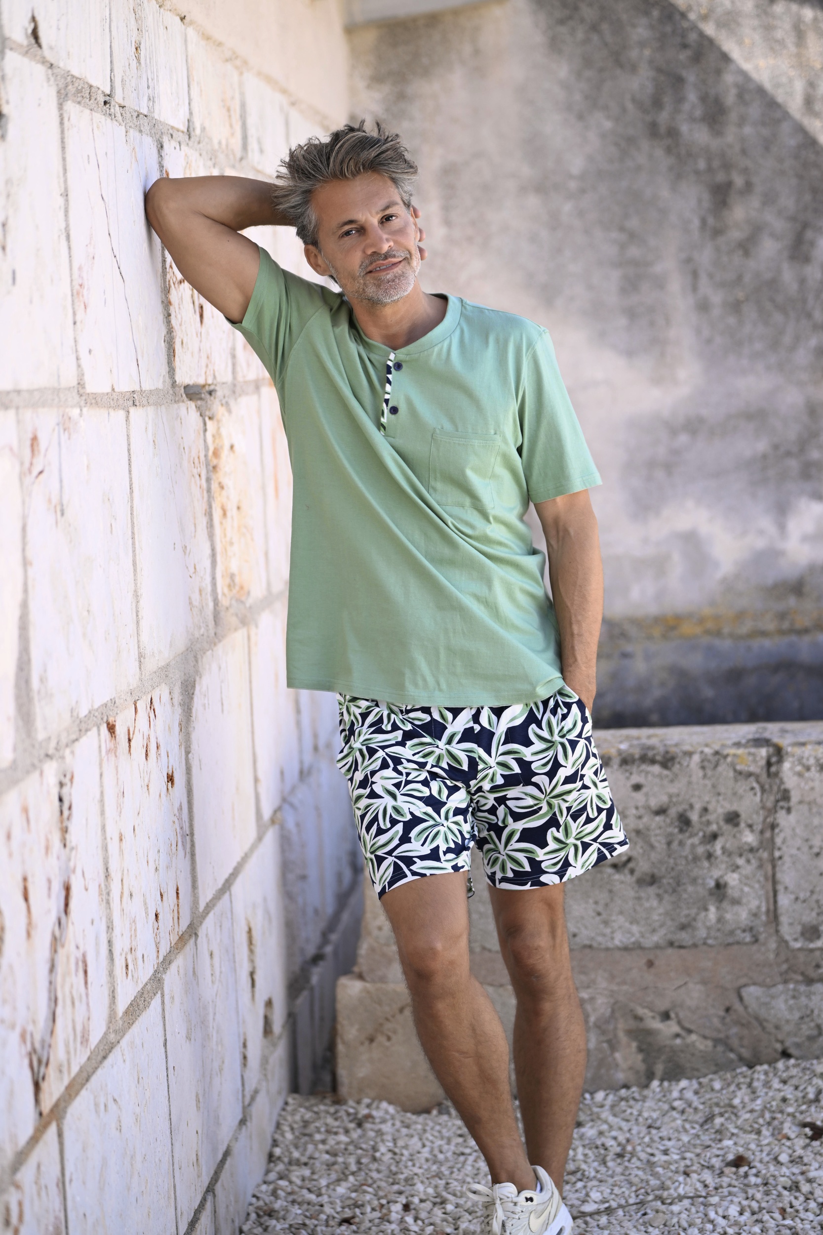 Jung und modern stellt sich dieser Kurzpyjama vor. Im trendigen, abstrakten Dessin ist die Bermudahose ein richtiger Blickfang. Praktisch ist der dehnbare Hosenbund mit Gummizug und seitliche Eingrifftaschen. Das Oberteil in Uni ist perfekt abgestimmt und eine schöne Ergänzung. Mit Strickbündchen am Ausschnitt und kurzer Knopfleiste für mehr Komfort. Hergestellt aus hochwertiger Baumwolle in Single Jersey-Qualität liegt der Stoff weich auf der Haut und sorgt für vollsten Tragekomfort. Ideal für eine erholsame Nacht und entspannte Stunden zu Hause.