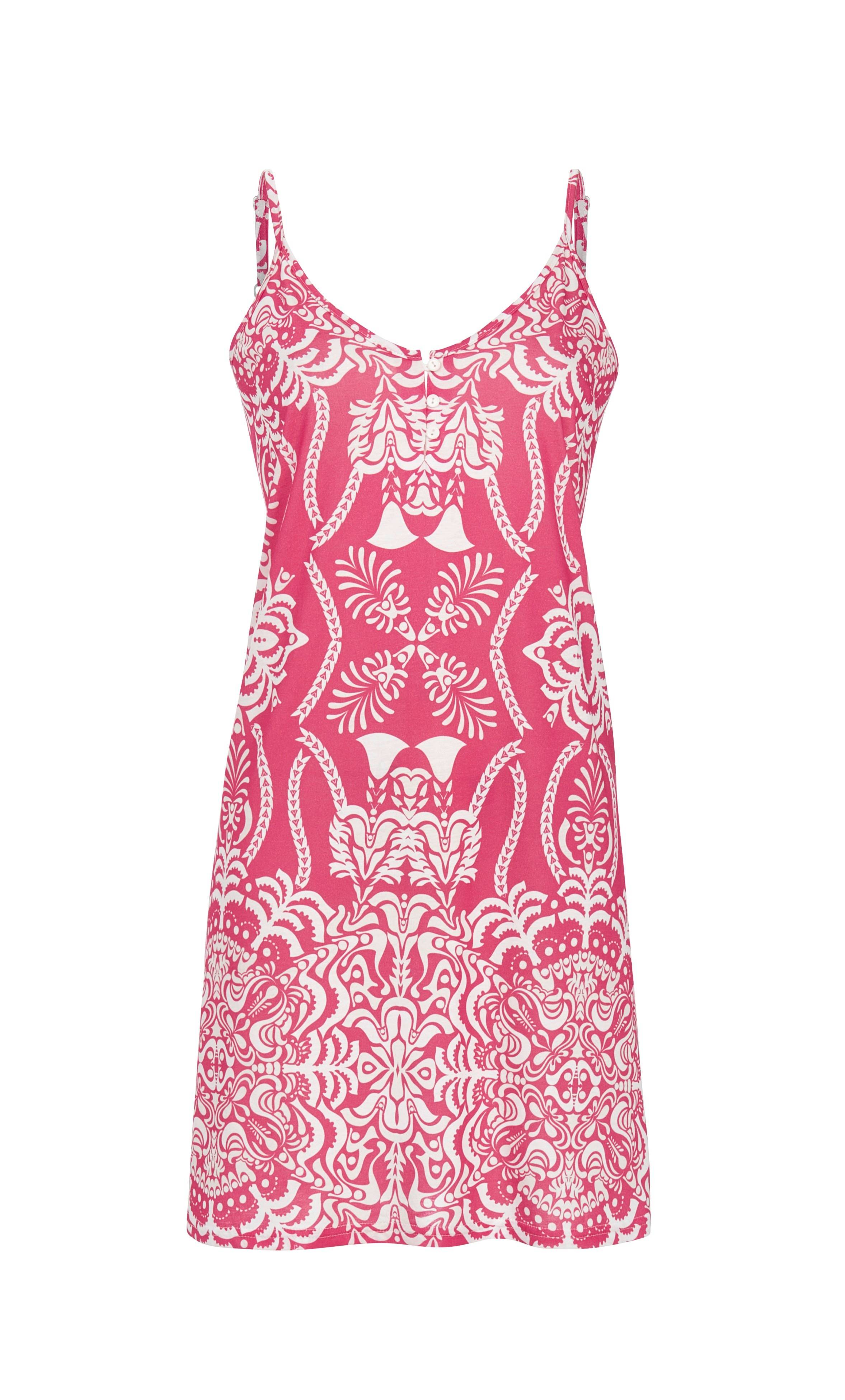Dieses angenehme Kleid besticht durch sein ornamentales Dessin, das jedes Teil zu einem Unikat macht. Verstellbare Spaghettiträger sorgen für eine individuelle Passform. Die kurze Knopfleiste verleiht einen lässigen Look. Gefertigt aus hochwertiger Baumwoll-Modal-Mischung in Single Jersey-Qualität, bietet es ein samtweiches Tragegefühl und hohen Komfort. Der perfekte Style für entspannte Tage und sommerliche Stunden.