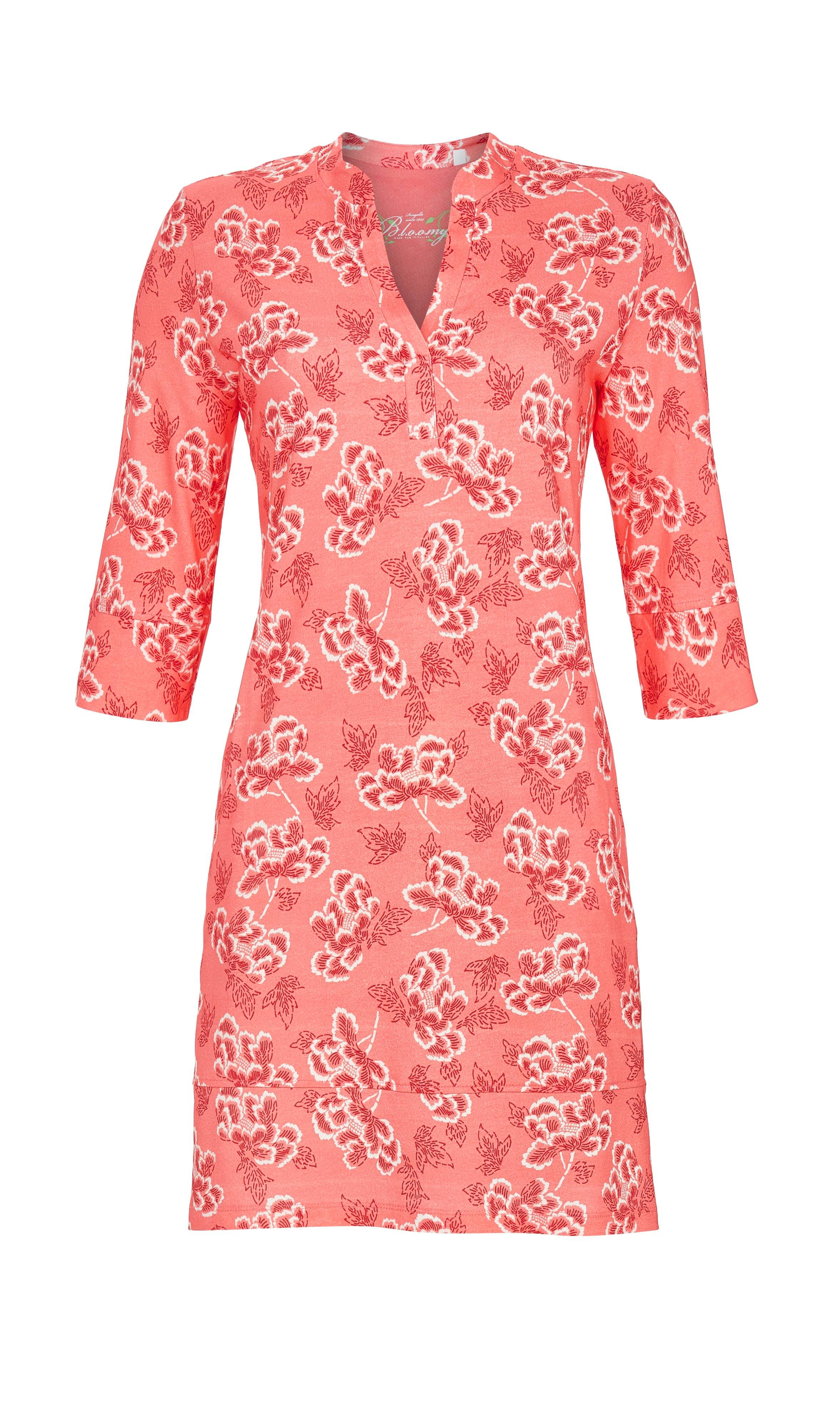 Tunika-Kleid mit V-Ausschnitt und 3/4-Ärmeln, gefertigt aus hochwertiger Baumwoll-Modal-Ware in Single Jersey-Qualität. Das Material ist von schöner Farbbrillanz. Das florale Dessin verleiht dem Outfit einen femininen Touch. Seitliche Eingrifftaschen und Seitenschlitze am Saum sorgen für zusätzlichen Komfort und geben mehr Bewegungsfreiheit. Perfekt für einen angenehmen Start in den Tag.